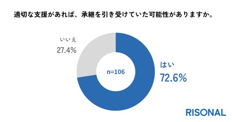 - 72.6%が、適切な支援があれば承継を引き受けていた可能性あり